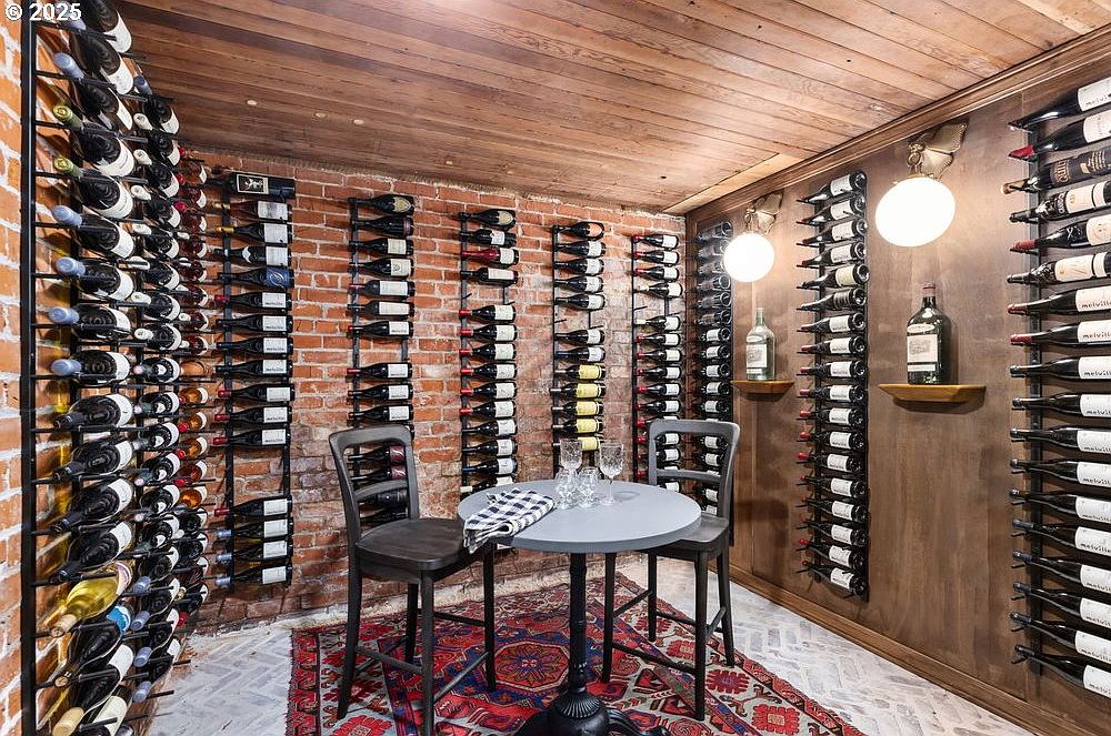 A cozy wine cellar features exposed brick walls and wood plank ceilings, evoking a sense of rustic charm. Black metal racks line the perimeter, showcasing an extensive collection of neatly stored wine bottles. The center of the room holds a small round table with two classic chairs, perfect for intimate tastings or conversations. A vibrant patterned rug warms the stone-tiled floor, adding a pop of color and comfort to the space. Soft globe sconces provide inviting ambient lighting, making the room both functional and welcoming. Ideal for small family gatherings or entertaining friends in a stylish, relaxed setting.