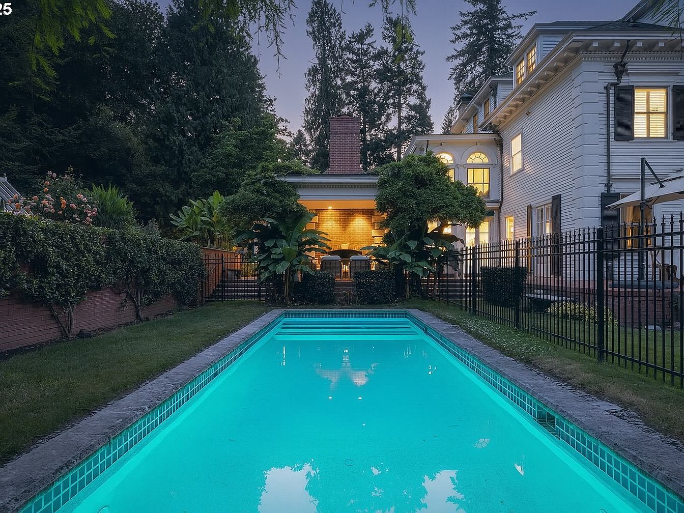 A pristine backyard pool is the centerpiece of this inviting outdoor retreat, framed by lush greenery and mature trees for privacy and serenity. Elegant black fencing provides a secure, family-friendly environment, allowing children to play safely while adults relax nearby. The pool is bordered with classic stonework that complements the historic architecture of the adjacent white home, complete with decorative trim and abundant windows. An illuminated covered patio at the far end creates a warm ambiance for evening gatherings, featuring ample seating and cozy lighting perfect for family dinners or celebrations under the stars. The landscape balances privacy, comfort, and timeless sophistication.