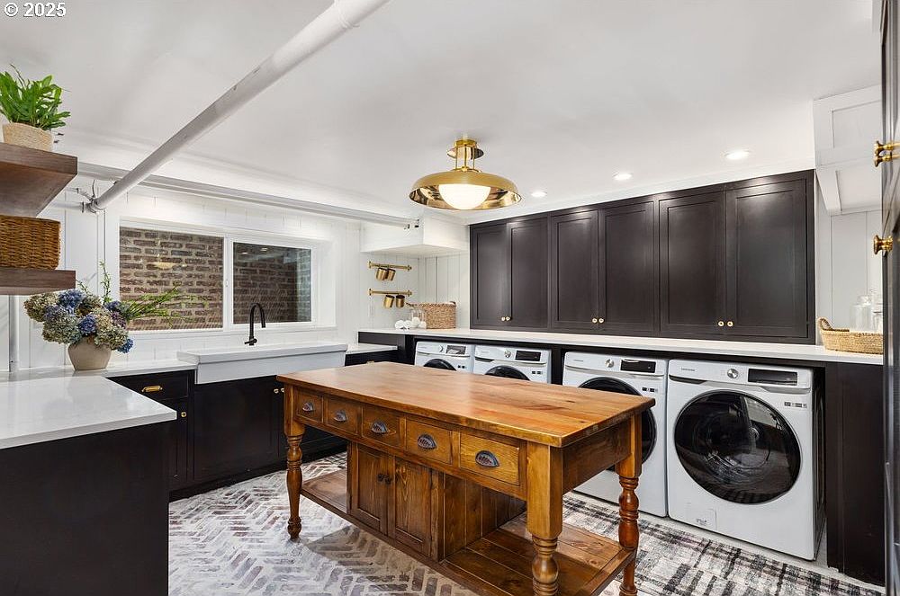 Spacious and thoughtfully designed, this laundry room features a full wall of sleek black cabinetry offering ample storage for household essentials. Four front-loading machines are neatly lined up beneath a long white countertop, creating plenty of space for sorting and folding clothes. A rustic wooden island with deep drawers anchors the room and provides an additional work surface, ideal for family projects or organizing laundry loads. Large windows flood the room with natural light, while open shelving and baskets keep supplies within easy reach. The space combines practicality and warmth, with stylish brass accents and a herringbone-patterned floor adding a touch of elegance.