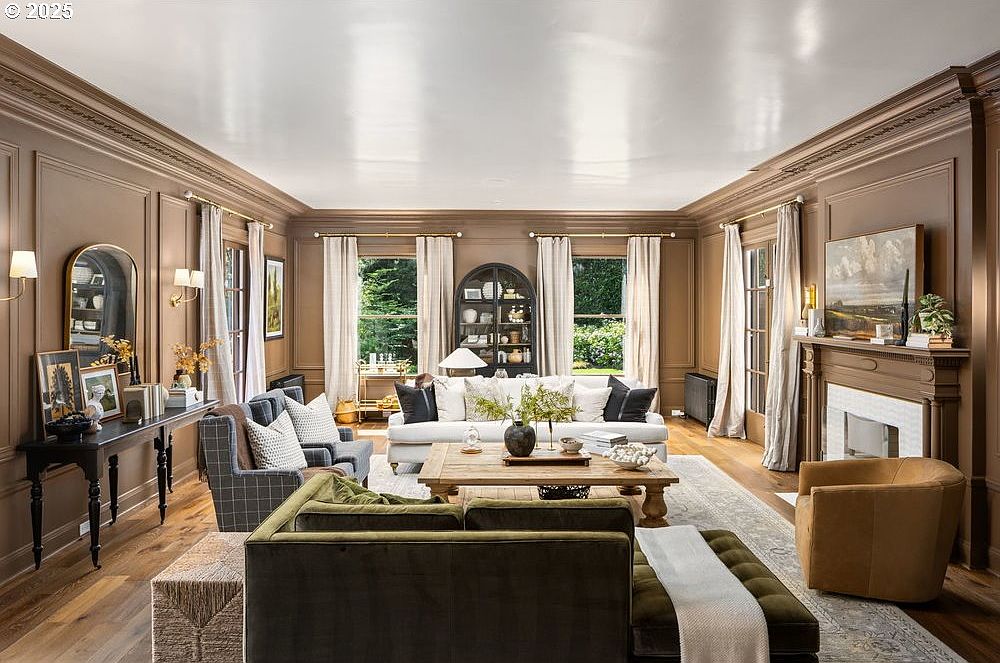 A spacious living room with richly paneled brown walls and detailed crown molding, offering a warm, inviting atmosphere. Floor-to-ceiling windows fill the space with natural light, highlighting plush seating arranged around a classic wood coffee table. An olive-green velvet sofa adds a modern touch, while an armchair and a white sectional provide ample seating for gatherings. The fireplace, adorned with art and greenery, serves as a cozy focal point. Soft neutral drapery, hardwood flooring, and decorative accents like table vases and framed photos create a stylish yet comfortable setting perfect for family relaxation and entertaining.