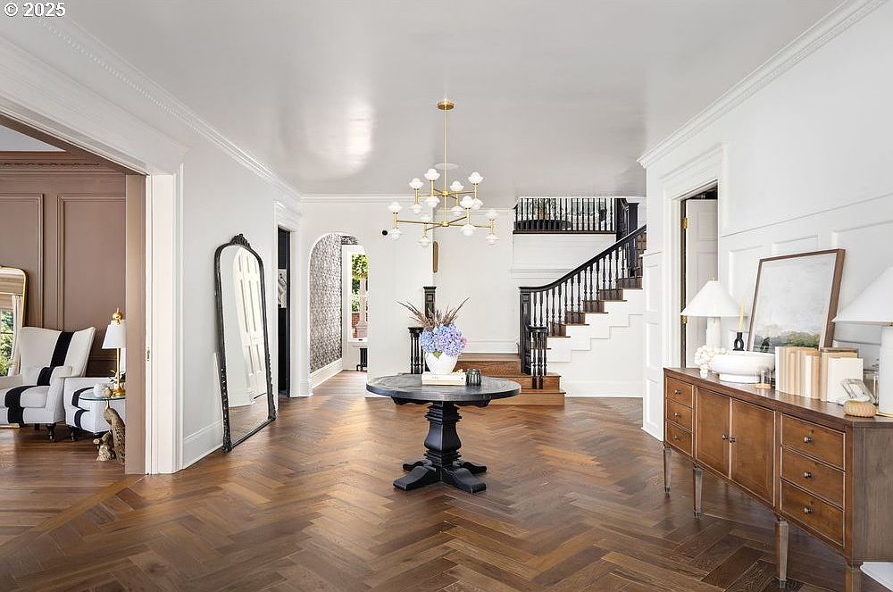 A spacious and welcoming foyer featuring classic herringbone wood flooring and crisp white walls. A round black center table with fresh flowers creates an inviting focal point, complemented by an elegant contemporary chandelier. The entryway is flanked by a stylish console with books and decor, a large floor mirror for last looks before heading out, and a grand staircase with contrasting dark railing and white risers. Family-friendly design is seen in the open flow to adjoining spaces, baby-proofed airy staircase, and uncluttered layout for easy movement. Neutral tones, sophisticated furniture, and refined moldings exude timeless elegance and warmth perfect for family gatherings.