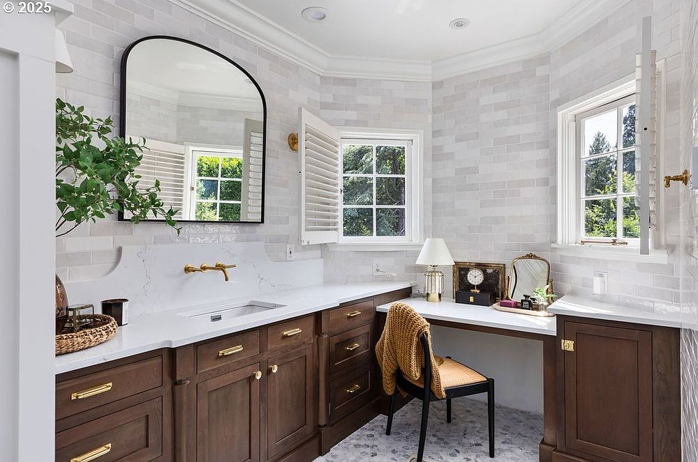 This thoughtfully designed bathroom features an elegant combination of function and style, highlighted by custom walnut cabinetry with brass hardware and crisp white quartz countertops. The L-shaped layout maximizes workspace with a vanity area that seamlessly transitions into a built-in desk, perfect for multitasking or a touch of personal organization. Abundant natural light pours through the classic grid windows with white shutters, illuminating the soft gray and white subway tile walls. Warm tones from the wood cabinetry and inviting decor accents create a welcoming, family-friendly atmosphere ideal for busy mornings or peaceful evening routines.