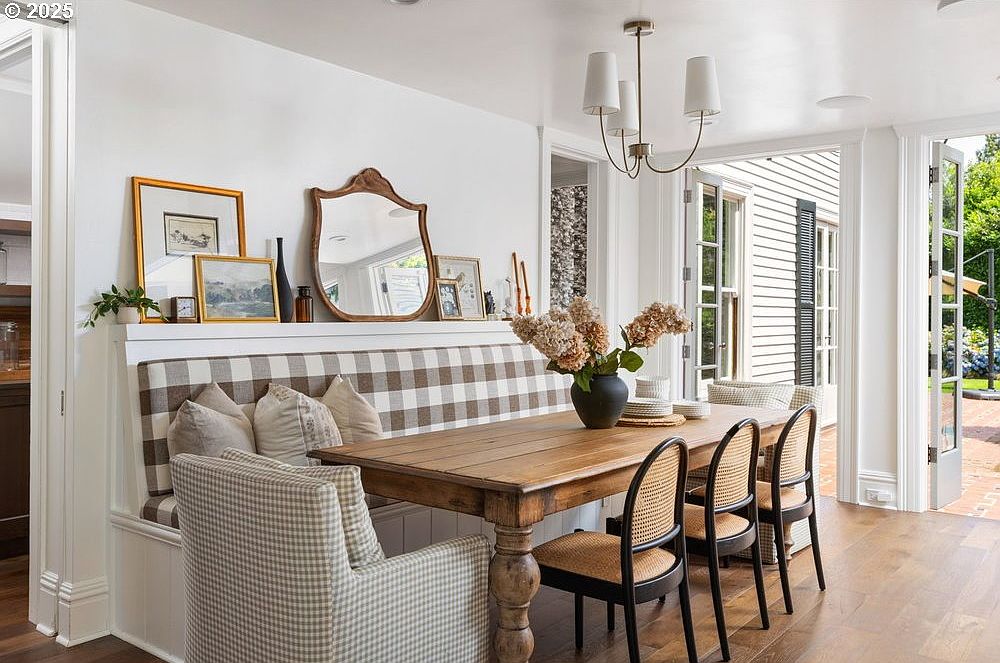 A cozy dining nook embraces warmth and comfort with its built-in bench featuring brown and cream checkered upholstery, layered with assorted neutral throw pillows, perfect for family meals and gatherings. The rustic wooden table anchors the space, complemented by woven-back chairs that add casual elegance. Above the bench, a charming mix of framed art and a curvy mirror injects personality against crisp white walls, while a simple vase of dried flowers brings a natural touch. French doors flood the area with sunlight and open onto the patio, creating seamless indoor-outdoor flow, ideal for entertaining or relaxed family living. Hardwood floors complete the welcoming atmosphere.