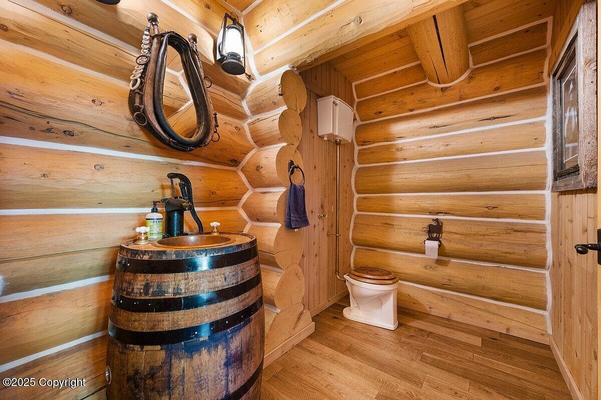 This rustic bathroom embraces a charming log cabin aesthetic, featuring natural wood paneling and a cozy layout. The standout barrel sink, crafted from wood, offers a unique contrast against the deep brown hues of the floor and exposed logs. An old-fashioned pump faucet adds a touch of vintage allure, accompanied by a handcrafted mirror framed with riding gear, enhancing the country theme. The warm beige color scheme invites relaxation, while practical elements like a mounted towel rack ensure convenience. Soft lighting from the lantern-style fixtures creates an inviting ambiance, perfect for family-friendly functionality.