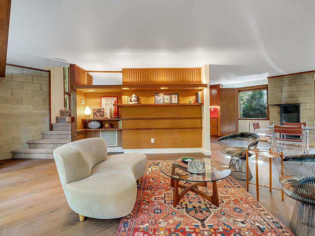 This cozy living room features a harmonious blend of modern and mid-century design elements. A curved, light-colored sofa invites relaxation, complemented by two stylish metal chairs, providing ample seating for family gatherings. The warm wooden accents in the shelving and staircase add a delightful contrast to the tailored gray stone walls, creating visual interest. A vibrant area rug with intricate patterns enhances the comfort and warmth of the space, while the natural light streams in through large windows, illuminating the thoughtful decor. This welcoming environment fosters both intimate family moments and entertaining guests.