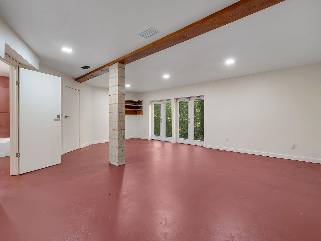 This spacious family room boasts an open layout, designed for comfort and versatility. Featuring a warm, earthy color palette with soft white walls complemented by rich wooden accents, the room radiates a welcoming atmosphere. The unique cement post adds architectural interest while offering structural support. Large windows invite natural light, enhancing the cozy ambiance and connecting the indoor space with the lush greenery outside. The smooth, terracotta-hued flooring provides an excellent foundation for various furniture arrangements, making it ideal for gatherings. With ample room for play and relaxation, this family-friendly area encourages everyday enjoyment and shared moments.