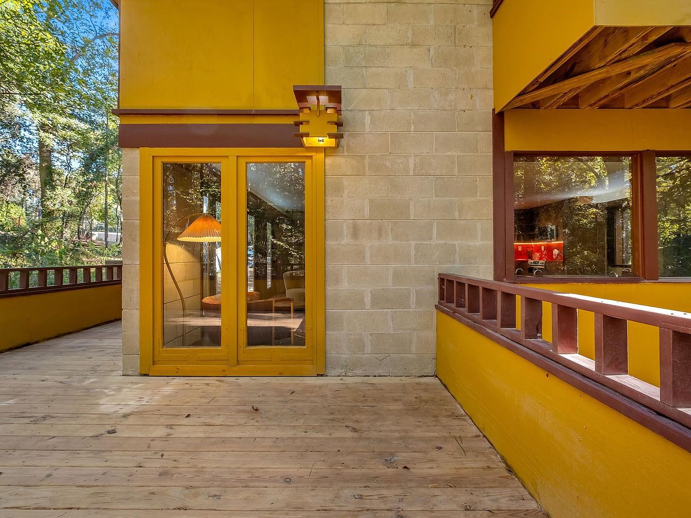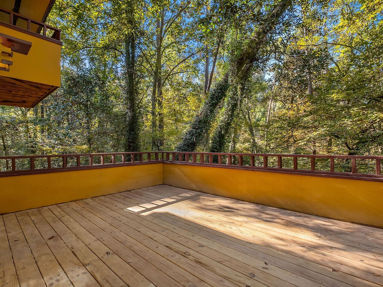 This inviting outdoor deck seamlessly blends with nature, providing an ideal retreat for relaxation and family gatherings. The expanse of natural wood flooring showcases a warm aesthetic, inviting barefoot strolls under the sun. Vibrant yellow walls enhance the cheerful atmosphere, contrasting beautifully with the lush greens surrounding the space. A low wooden railing offers safety while maintaining unobstructed views of the serene forest, making it a perfect spot for enjoying morning coffee or evening stargazing. Its open layout lends itself to creative furnishing options, from cozy seating arrangements to dining setups, accommodating all your entertaining needs.