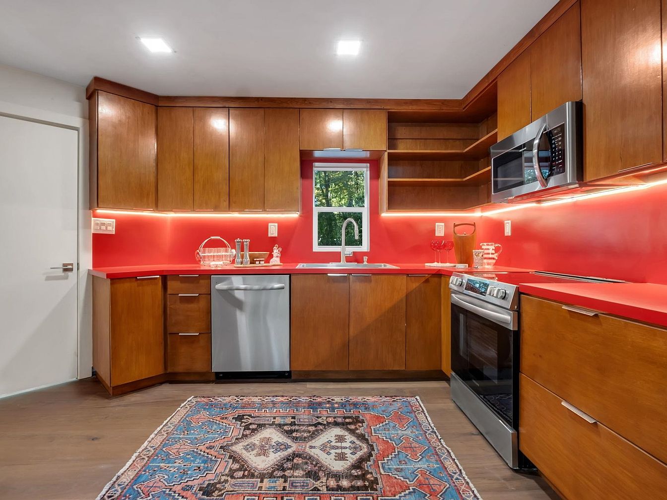 This stunning kitchen features rich wooden cabinetry paired with a vibrant red countertop, creating a bold yet harmonious focal point. Open shelving offers practicality and allows for decorative elements, enhancing the room’s warmth. A sleek stainless-steel refrigerator and an oven add a modern touch, while under-cabinet lighting creates an inviting atmosphere. The layout emphasizes efficiency, making it ideal for family gatherings, with ample counter space for meal preparation and entertaining. A colorful area rug adds texture underfoot, complementing the overall design. Large windows flood the space with natural light, ensuring a cheerful and welcoming cooking environment.