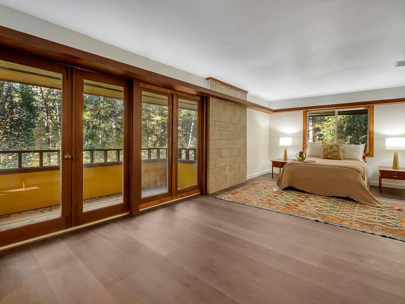 This serene master bedroom features large glass doors that invite natural light while offering breathtaking views of the surrounding woods. The spacious layout is defined by warm wooden elements, including the stylish trim and furniture. A cozy bed, adorned with a textured taupe blanket and decorative pillows, promises comfort. Two elegant nightstands with contemporary lamps frame the bed, providing both function and style. The rich area rug adds a touch of color, complementing the neutral tones throughout. With an atmosphere of tranquility and family-friendly features, this space is perfect for relaxation and family gatherings.