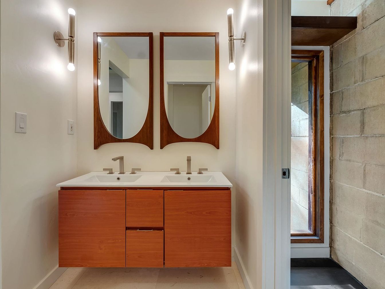 This contemporary bathroom boasts a dual vanity with a clean, minimalist design. The rich wooden cabinetry contrasts beautifully with the sleek white countertop, offering ample storage and a warm, inviting aesthetic. Each sink is adorned with modern fixtures that enhance the space’s functionality. Above, elegantly shaped mirrors add an artistic touch, while wall-mounted light fixtures illuminate the area without overwhelming it. The soft color palette of neutral tones promotes relaxation, and the large, frosted glass window allows natural light to filter through, creating an airy ambiance. This is a perfect blend of style and practicality for family living.