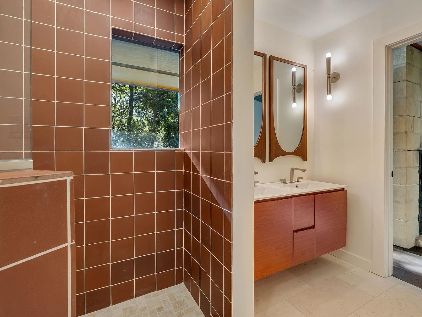This striking modern bathroom blends functionality with aesthetic appeal. The deep terracotta tiling envelops the shower space, creating a warm, inviting atmosphere. Natural light pours in through a well-placed window, enhancing the feeling of openness and connecting the indoor space with the lush outdoors. A sleek double vanity features rich wood cabinetry, complemented by elegant mirrors that add a touch of sophistication. Minimalist lighting fixtures and clean lines define the modern sensibility, while the neutral stone flooring adds a tactile contrast. This space prioritizes comfort and usability, making it an ideal family-friendly retreat.