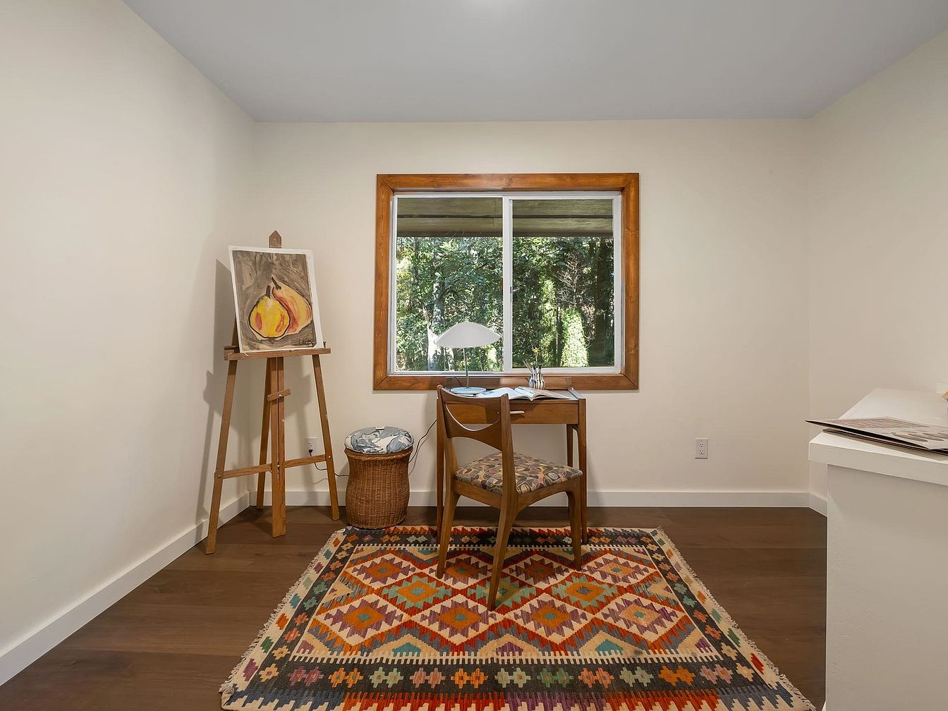 This cozy creative workspace is illuminated by natural light pouring in from a large window, offering serene views of greenery outside. The warm wooden accents of the window frame complement the rich tones of the hardwood flooring, enhancing the inviting atmosphere. A handwoven rug featuring vibrant patterns adds a splash of color and character beneath a simple wooden desk and a comfortable chair, promoting productivity and comfort. An easel stands ready for artistic endeavors, while neatly arranged supplies in a charming basket keep the space organized. This room seamlessly blends functionality with a touch of artistic flair, fostering inspiration.