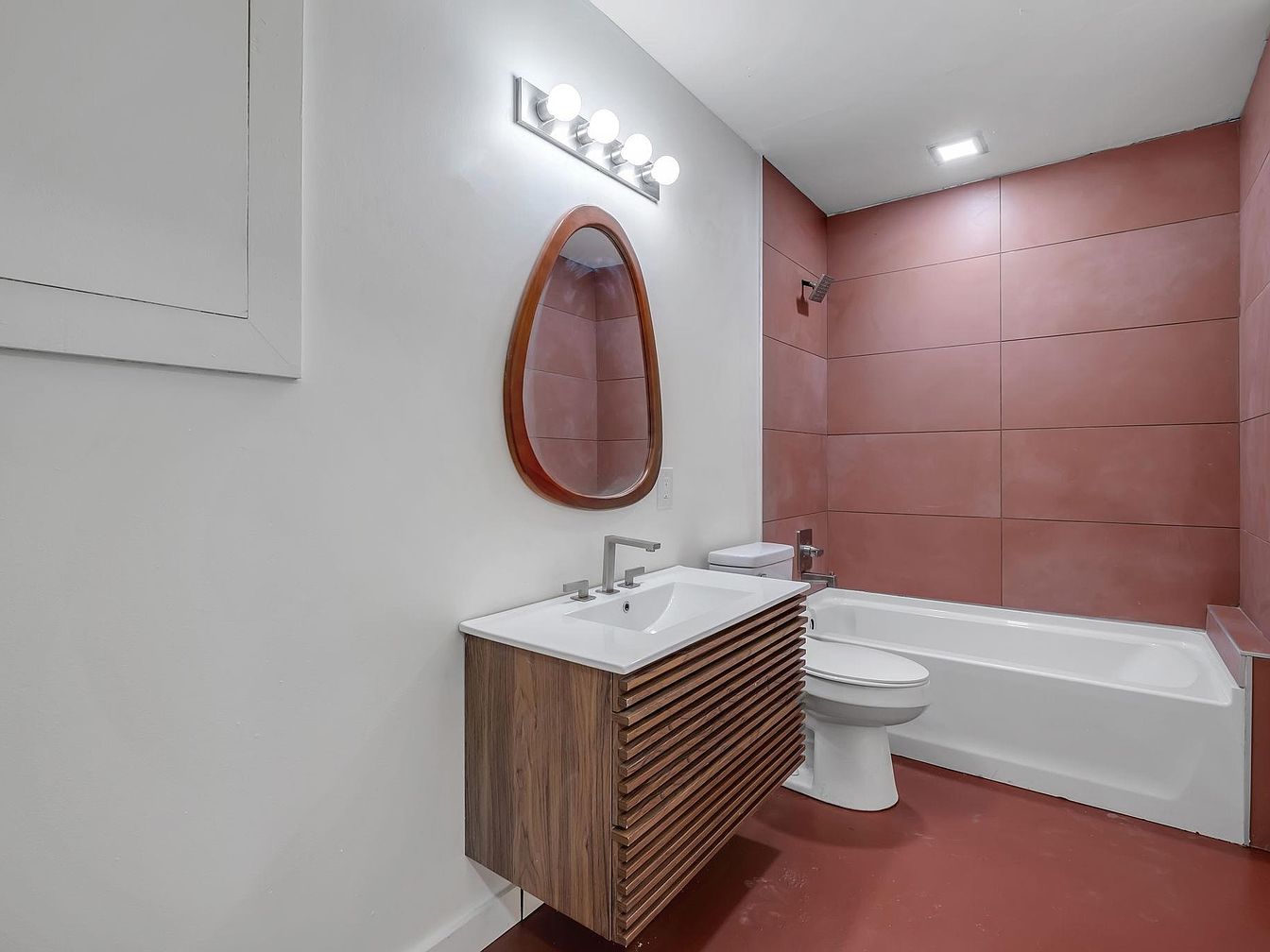 This contemporary bathroom showcases a meticulous blend of functionality and style. The layered terracotta tiles on the walls complement the sleek white fixtures, creating a warm yet fresh atmosphere. A chic oval mirror enhances the space, paired with modern lighting for a bright ambiance. The wooden vanity offers ample storage with its textured drawers, combining elegance with practicality. A spacious bathtub invites relaxation, while the compact toilet maintains an efficient layout. The room’s color scheme, dominated by earthy tones, promotes comfort, making this bathroom a family-friendly retreat for daily routines and unwinding moments.