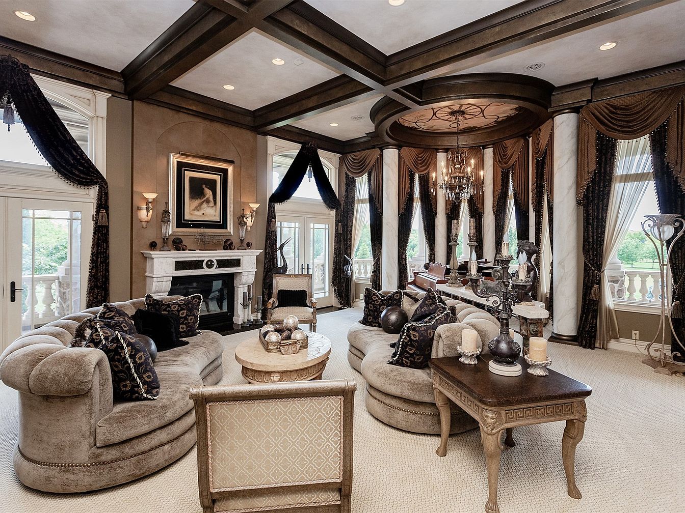 This elegant living room features sophisticated design elements that radiate luxury. A stunning coffered ceiling draws the eye upward, accentuated by tasteful lighting fixtures and rich, dark wood tones. Plush, curvaceous sofas, adorned with decorative pillows, provide ample seating while infusing comfort into the space. The color palette blends warm neutrals with deep blues and golds, creating a cozy yet refined atmosphere. A marble fireplace serves as a striking focal point, beautifully complemented by elegant artwork and vintage accents. Extravagant drapes frame the large windows, allowing natural light to cascade over the plush carpeting, establishing an inviting family-friendly environment.