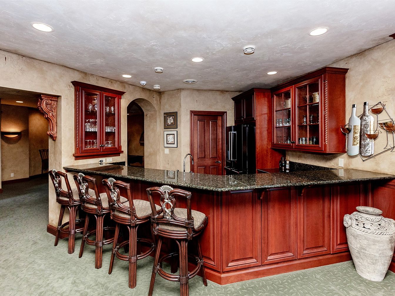 This elegant home bar showcases a rich blend of functionality and style, featuring dark wood cabinetry with glass-front displays that invite creativity and social gatherings. The bar counter, adorned with a polished black granite surface, is complemented by intricately designed high-backed stools that enhance comfort. Soft lighting, set against warm, textured walls, offers a cozy atmosphere, perfect for family evenings or entertaining guests. The detailing includes decorative wall art and a unique bottle display, seamlessly merging aesthetics with practicality, making it an ideal space for unwinding and enjoying memorable moments.