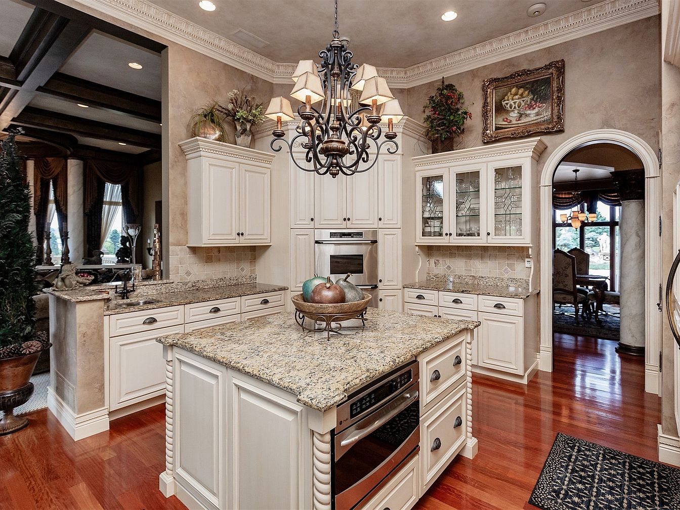 This elegant gourmet kitchen features a spacious layout, ideal for family gatherings and culinary adventures. The stunning granite countertops offer both beauty and functionality, while the creamy white cabinetry provides ample storage, blending seamlessly with the soft, warm color palette. A chandelier overhead adds a touch of sophistication, complemented by the intricate crown molding. The subtle tile backsplash enhances the aesthetic appeal without overpowering the space. Nearby, large windows invite natural light, illuminating the room and offering views of the surroundings. Family-friendly features, such as easy-to-clean surfaces and an open design, make this kitchen both practical and inviting.