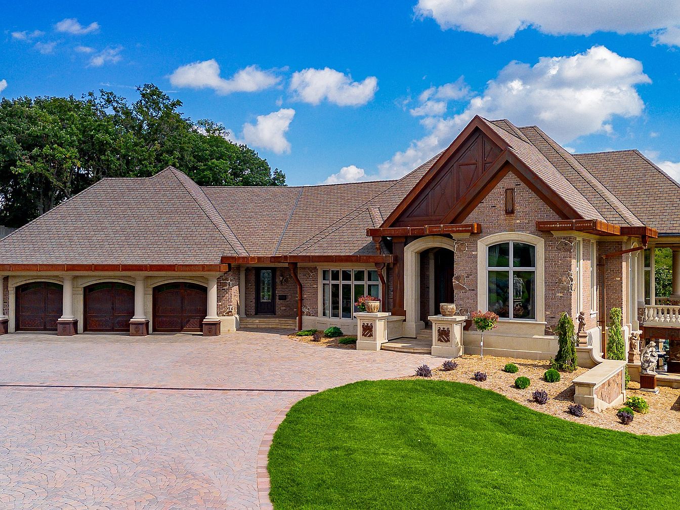 A stunning front entrance showcases a blend of stone and modern wood accents, exuding both elegance and warmth. The expansive driveway, paved with intricate patterns, leads up to three elegant garage doors adorned with rustic wooden finishes. Lush green lawns frame the inviting porch, where classic planters add a touch of floral beauty. The high-peaked roof features architectural overhangs, highlighting the detailed craftsmanship. Large windows allow natural light to flood the interior, offering views of the inviting foyer. This family-friendly design emphasizes outdoor connection while providing ample space for social gatherings and serene relaxation.