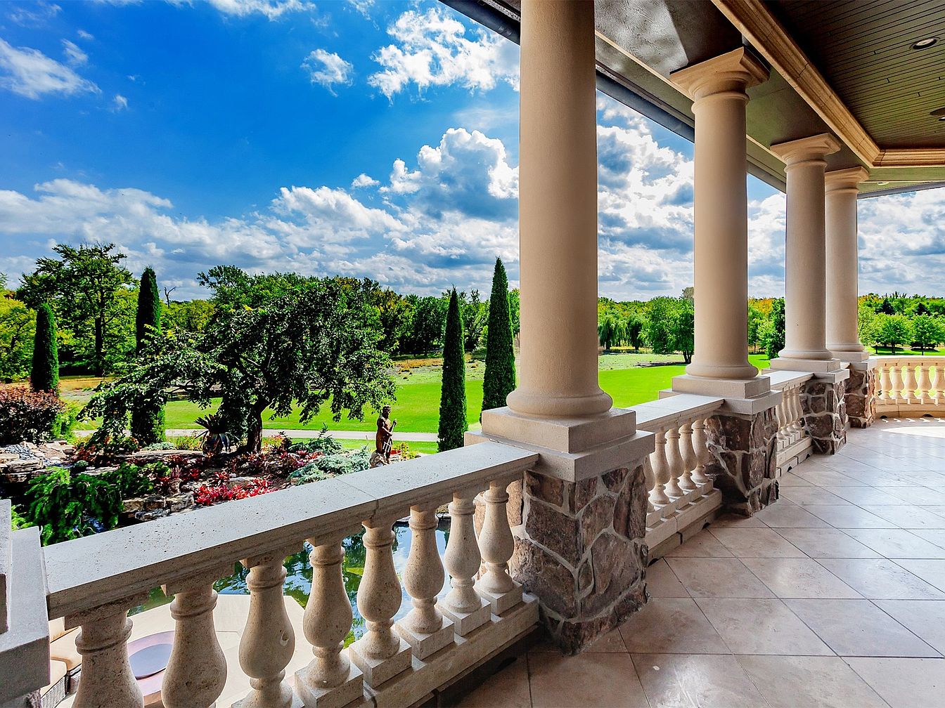 This stunning veranda offers an expansive view of lush greenery and beautifully manicured gardens. The open layout features elegant stone columns and a stylish balustrade that adds to the refined aesthetic. Soft tile flooring complements the light beige and earthy tones of the architecture, promoting a serene atmosphere. Ample space allows for family gatherings, with room for comfortable outdoor furniture. The ceiling’s design enhances natural light, making it an inviting area for relaxation or entertaining guests. Framed by nature, this outdoor retreat harmonizes with the landscape, creating a perfect blend of sophistication and tranquility.
