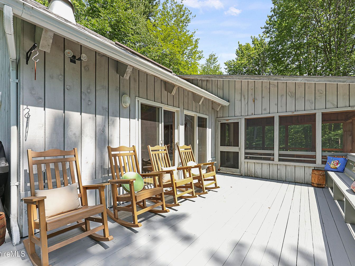 This inviting outdoor patio features a spacious deck adorned with several wooden rocking chairs, perfect for family gatherings or quiet evenings. The sleek, light-gray flooring enhances the open layout, creating a seamless transition between indoor and outdoor spaces. The walls, clad in charming rustic wood, echo a serene, cabin-like aesthetic, surrounded by lush greenery that brings nature close. Ample natural light pours in through large sliding doors, showcasing a seamless connection to the screened-in porch area, ideal for bug-free enjoyment. Decorative elements, like colorful cushions and planters, add personality, making this a perfect family-friendly retreat.