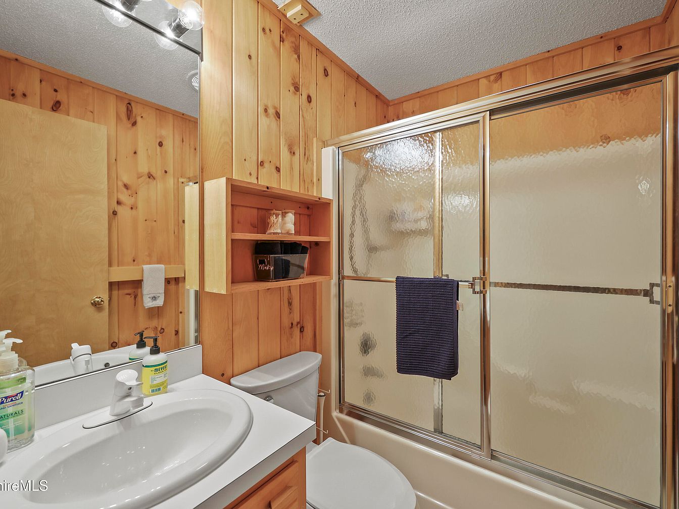 Warm tones of natural wood paneling envelop this inviting bathroom, creating a rustic yet modern atmosphere. The layout maximizes space, featuring a sleek white sink and a simple, functional toilet. A glass shower door adds a touch of elegance, while the strategically placed shelving offers practical storage for toiletries. The use of soft lighting enhances the cozy vibe, complemented by clean lines and minimal decor. Family-friendly features include easy access to essentials, and the color palette of earthy browns and whites promotes relaxation. Overall, this bathroom serves as a serene retreat for everyday use.
