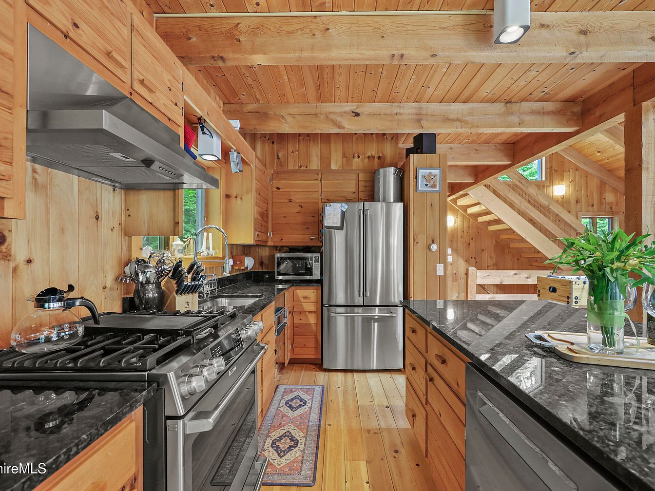 This kitchen boasts a warm, inviting atmosphere, characterized by rich wooden cabinetry and stunning exposed beams that enhance its rustic charm. The layout emphasizes functionality with stainless steel appliances seamlessly integrated into the space, providing a modern touch against the natural wood backdrop. A sleek black granite countertop offers ample workspace for culinary creations, while under-cabinet lighting highlights the beauty of the wood grain. Family-friendly features include a spacious island for gatherings and a cozy dining area, making it perfect for cooking and entertaining. Large windows allow natural light to flood in, creating a bright and cheerful environment.
