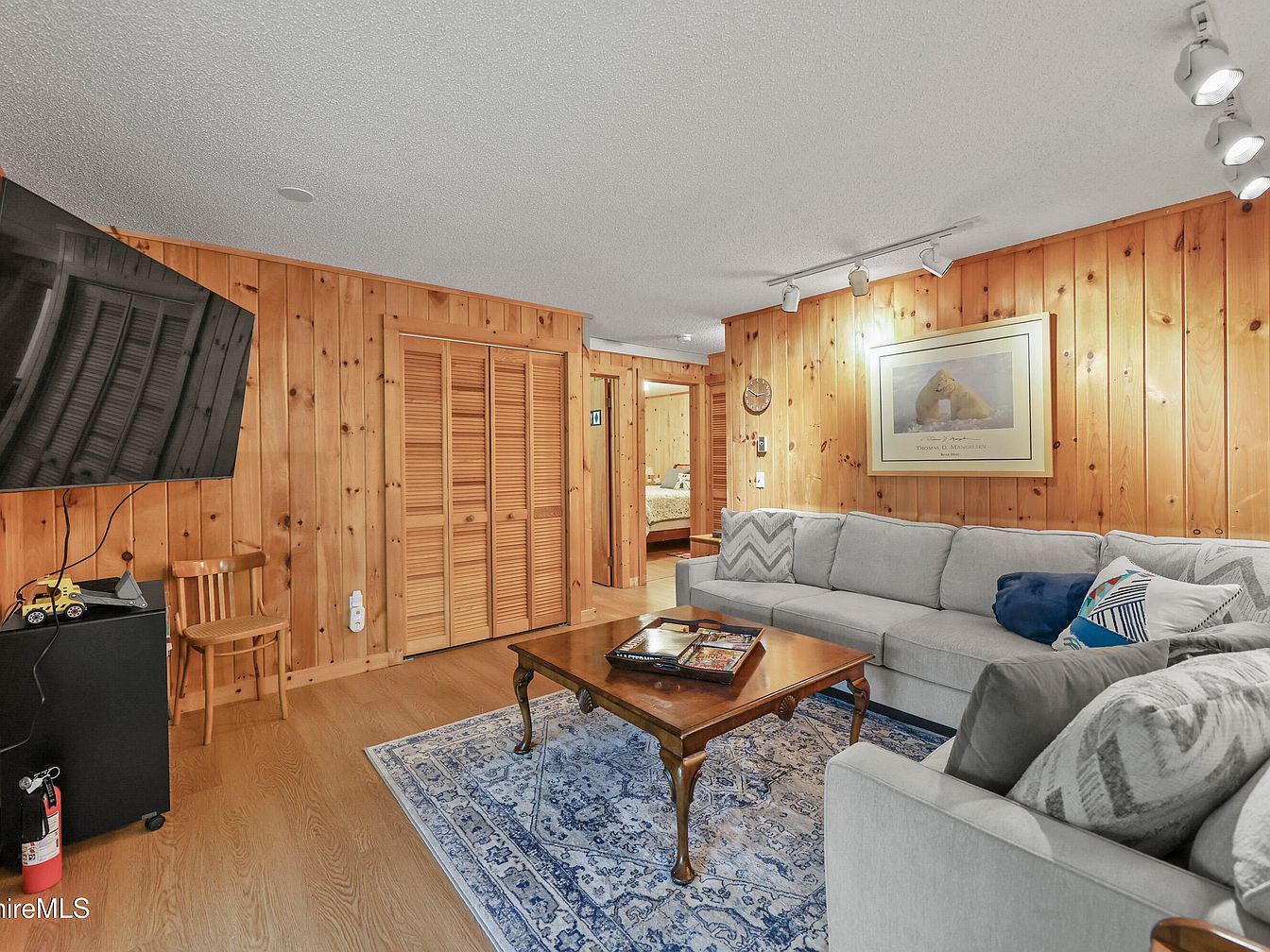 This inviting living room features warm wooden paneling, creating a rustic yet modern ambiance. A spacious gray sectional sofa adorned with patterned pillows invites family gatherings, while a classic wooden coffee table adds warmth to the space. Soft blue and white accents from the patterned area rug complement the room, enhancing its cozy feel. Recessed lighting and track lighting ensure flexibility in ambiance, while a mounted TV provides a perfect entertainment spot. Family-friendly elements, such as a durable rug and ample seating, make this room an ideal retreat for relaxation and play, promoting a welcoming environment for all ages.