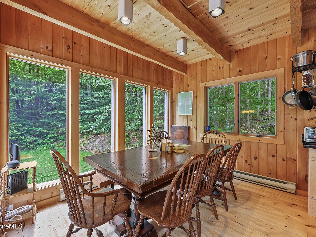 This inviting dining area features a rustic charm with warm wooden walls and beams, creating a cozy atmosphere. Ample natural light floods in through expansive windows, providing a stunning view of the lush greenery outside. The large, sturdy wooden table is perfect for family gatherings, surrounded by comfortable, classic spindle-back chairs. The decor includes subtle touches like a gold centerpiece and minimalistic artwork, enhancing the space without overwhelming it. Practical elements such as a nearby kitchen station for easy access and built-in storage options ensure functionality. This area harmonizes comfort, style, and nature beautifully, ideal for family meals.
