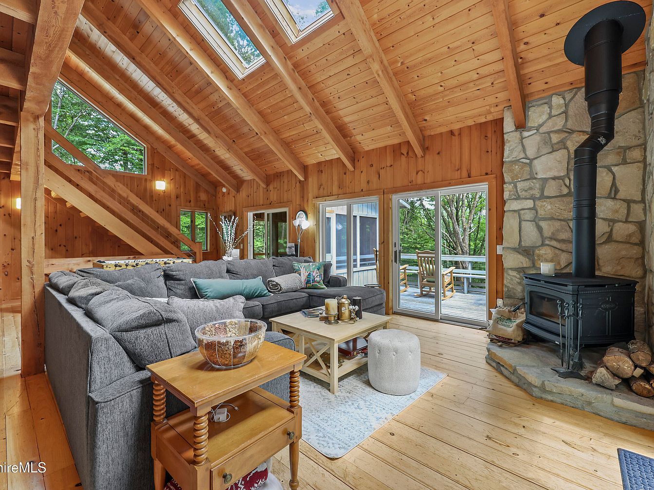 This inviting living area features stunning vaulted ceilings adorned with natural wood beams, creating a warm and open atmosphere. The walls are clad in rich timber, enhancing the cozy feel, while the large windows provide a picturesque view of the surrounding greenery. A comfortable sectional sofa is the focal point, accented by colorful throw pillows that add vibrancy. A stone fireplace complements the rustic charm, perfect for cozy evenings. Light hardwood floors contribute warmth and continuity, while an adjacent deck, accessible through sliding doors, extends the indoor-outdoor living experience, making it ideal for family gatherings.