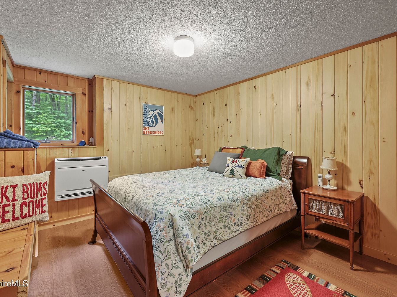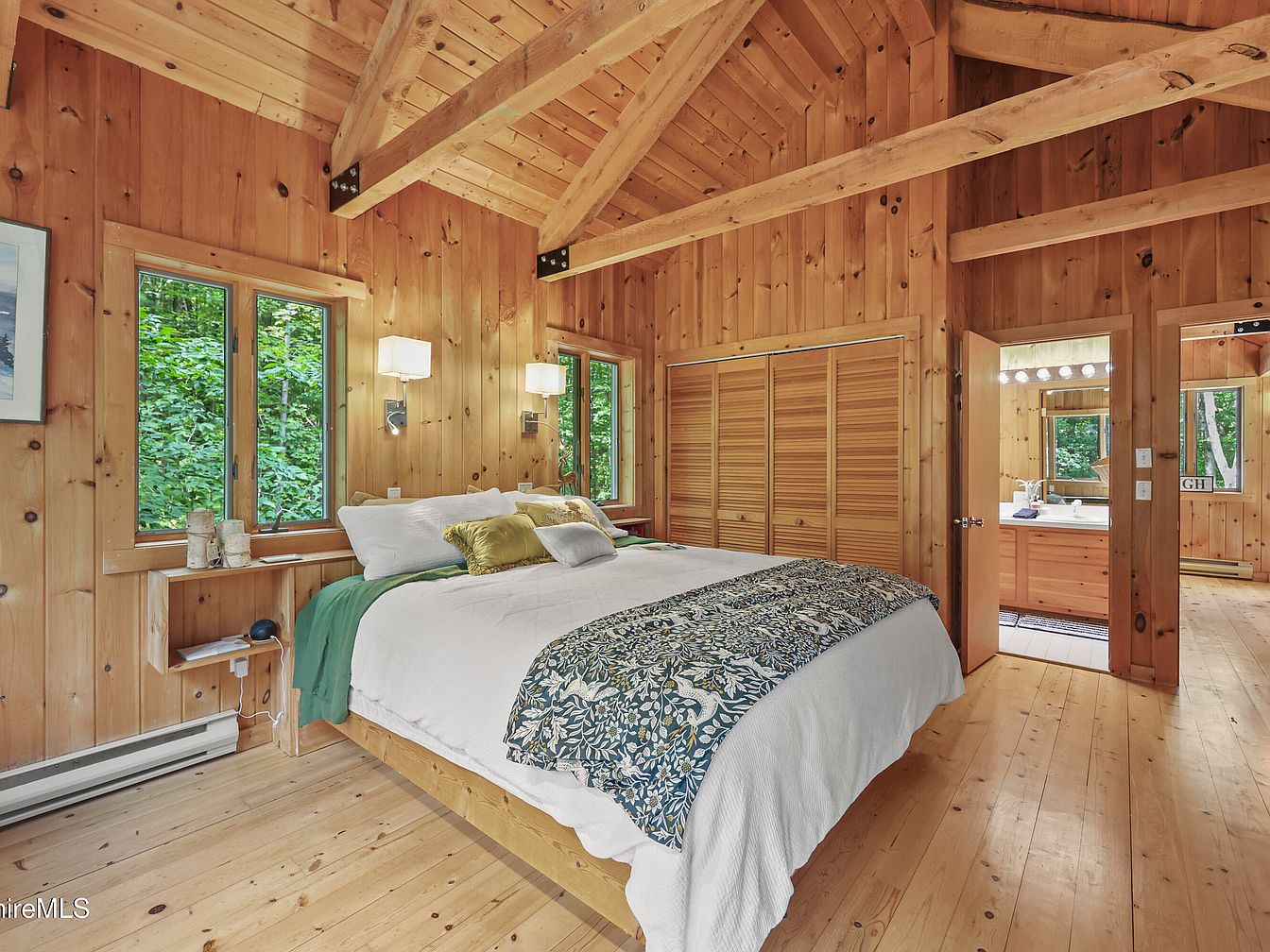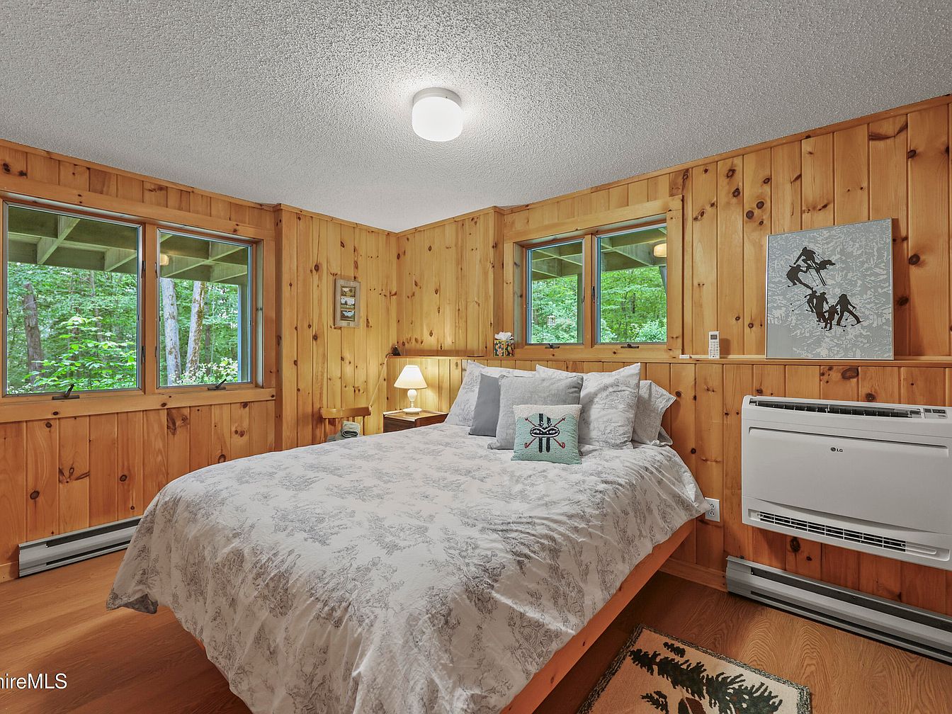 This charming bedroom features a warm wooden paneling that creates a cozy, inviting atmosphere. The layout maximizes natural light with large windows showcasing a serene view of the surrounding forest. A plush bed adorned with soft, textured bedding serves as a focal point, complemented by decorative pillows adding a touch of personality. A petite bedside table with a lamp provides perfect lighting for nighttime reading. The flooring features rich hardwood, enhancing the rustic feel, while an efficient heating unit ensures year-round comfort. This space perfectly balances functionality with stylish aesthetics, ideal for relaxation and rejuvenation.