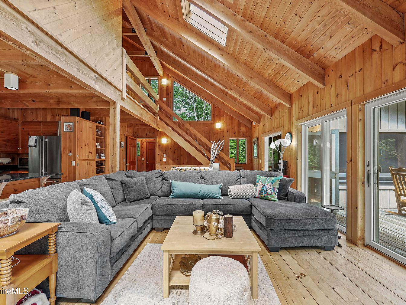 This inviting living room showcases a spacious open layout, harmonizing rustic charm with modern comfort. A large, plush sectional sofa, adorned with colorful pillows, creates an inviting focal point, while warm wood paneling and beams enhance the cozy atmosphere. Natural light pours in through expansive windows and skylights, illuminating the elegant hardwood flooring. The space is family-friendly with ample seating and a central coffee table, perfect for gatherings. A subtle color palette of grays and earthy tones complements the lush outdoor views, highlighting the connection between indoor comfort and nature’s beauty. Thoughtful architectural details add character to the home.
