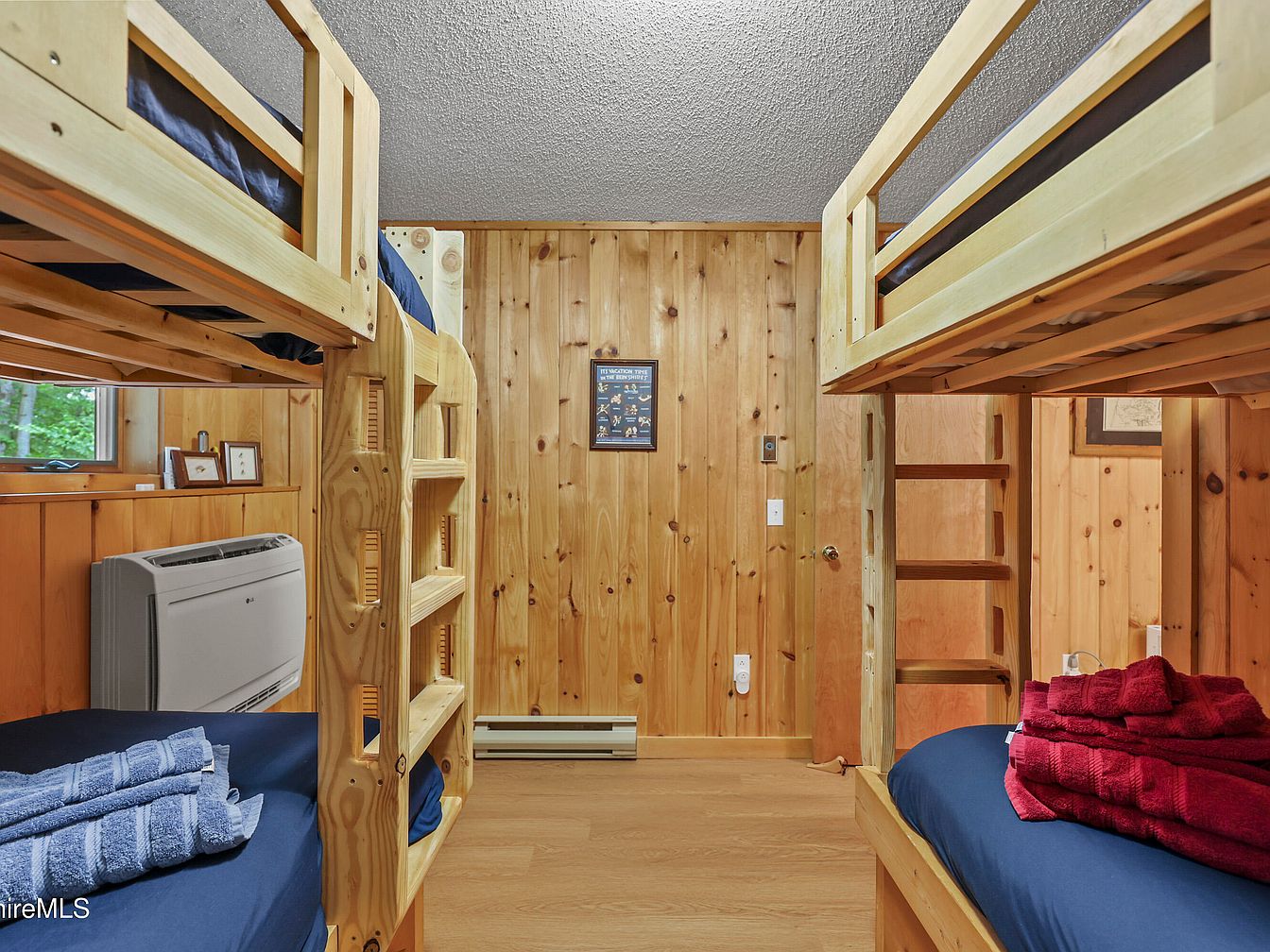 This cozy kid’s bedroom features a charming twin-over-twin bunk bed crafted from light wood, providing practical sleeping solutions for siblings or friends. The warm wooden paneling creates an inviting, cabin-like atmosphere, enhancing the room’s rustic feel. Rich blue bedding contrasts beautifully with the natural wood tones, while neatly folded towels in red add a splash of color. Large windows allow natural light to flood the space, creating a cheerful ambiance. Convenient air conditioning ensures comfort year-round, while the well-placed shelves and rustic decor offer both functionality and a touch of character, perfect for a playful, family-friendly environment.