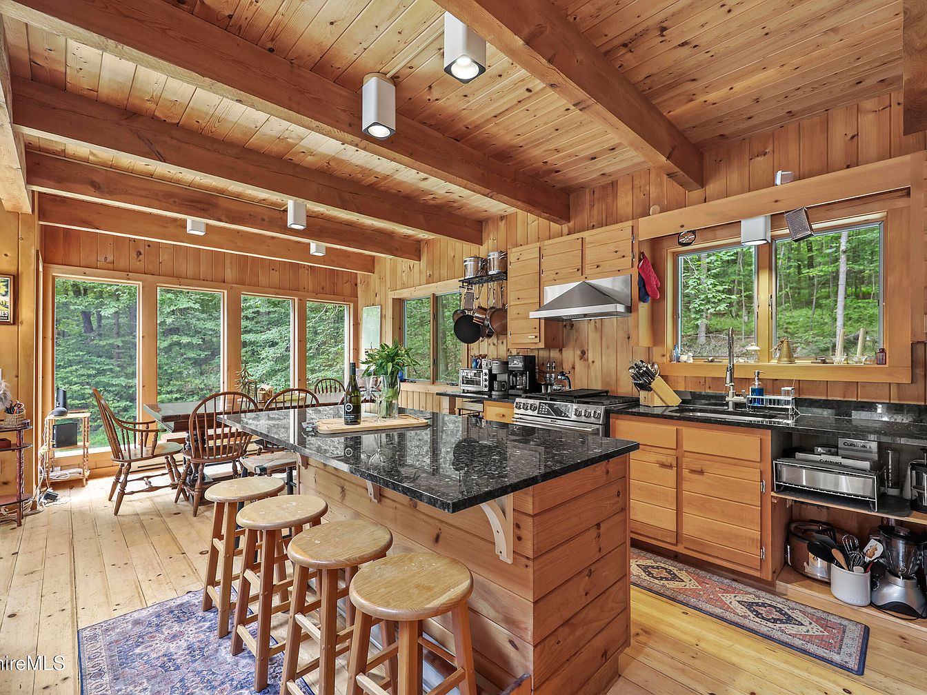 This inviting kitchen features warm wooden elements with rich grains and a cozy layout, embodying a rustic charm. The exposed beams add character to the vaulted ceiling while natural light pours in through large windows, creating a bright and airy atmosphere. A central island with a sleek black granite countertop serves as a perfect gathering spot, complemented by wooden bar stools. Surrounding cabinetry reflects a clean aesthetic with functional storage. The intimate dining area is accentuated by classic wooden chairs, providing a family-friendly environment ideal for shared meals and activities, harmonizing modern convenience with timeless elegance.