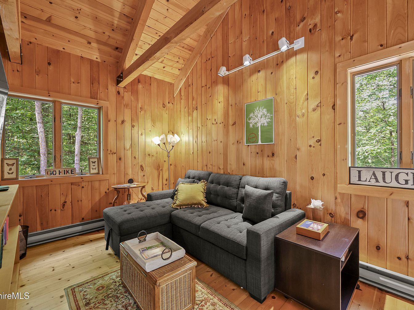 This inviting living space features warm wooden walls and a vaulted ceiling, creating a rustic yet modern atmosphere. The plush gray sectional sofa offers ample seating, complemented by a vibrant yellow accent pillow. Natural light streams through large windows, showcasing lush greenery outside, perfect for embracing nature. The decor includes charming accents like a humorous ‘LAUGH’ sign and framed artwork, enhancing the room’s coziness. A stylish side table and a unique wicker coffee table add functional elegance. Ideal for family gatherings or quiet evenings, this space beautifully marries comfort with a touch of woodland charm.