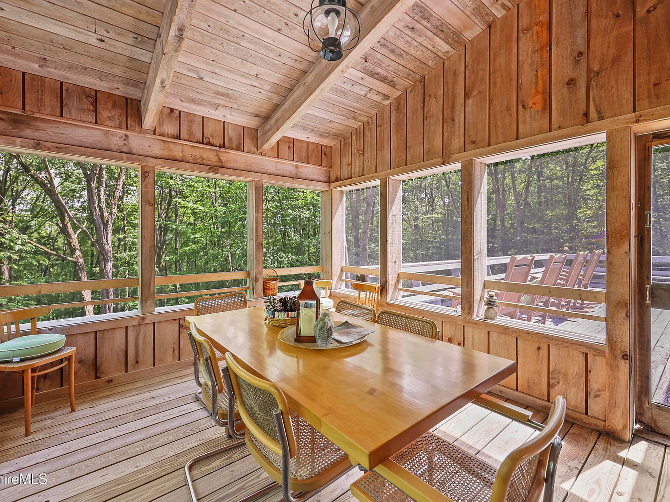 This inviting screened porch features a spacious wooden dining table that comfortably accommodates family gatherings, positioned to take advantage of the scenic wooded views. The natural wood paneling and high vaulted ceiling evoke a sense of warmth and coziness, enhanced by ample natural light filtering through the large screens. Comfortable seating, including a charming accent chair, invites relaxation. The earthy color palette of rich woods and soft neutrals harmonizes with the outdoor surroundings, creating a tranquil atmosphere perfect for meals or evening conversations. Thoughtfully designed for family-friendly interaction, this space balances rustic charm with a welcoming vibe.