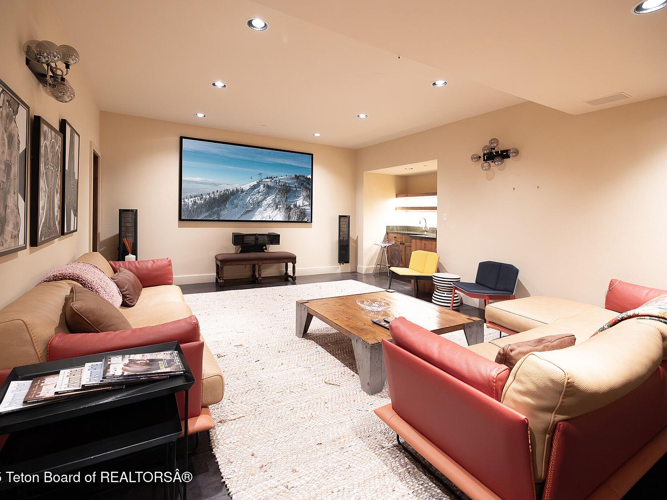 This inviting living room features a balanced blend of comfort and modern aesthetics, ideal for family gatherings or quiet nights in. Highlighted by a spacious layout, warm neutral walls and a striking large artwork enhance the serene atmosphere. The mix of bright accent chairs adds playful color, while the plush leather seating promises relaxation. The rustic wooden coffee table and a soft area rug ground the space, offering warmth beneath the feet. Open access to the adjoining kitchenette ensures convenience for entertaining, while recessed lighting and stylish fixtures add a contemporary touch, making this room both functional and stylish.