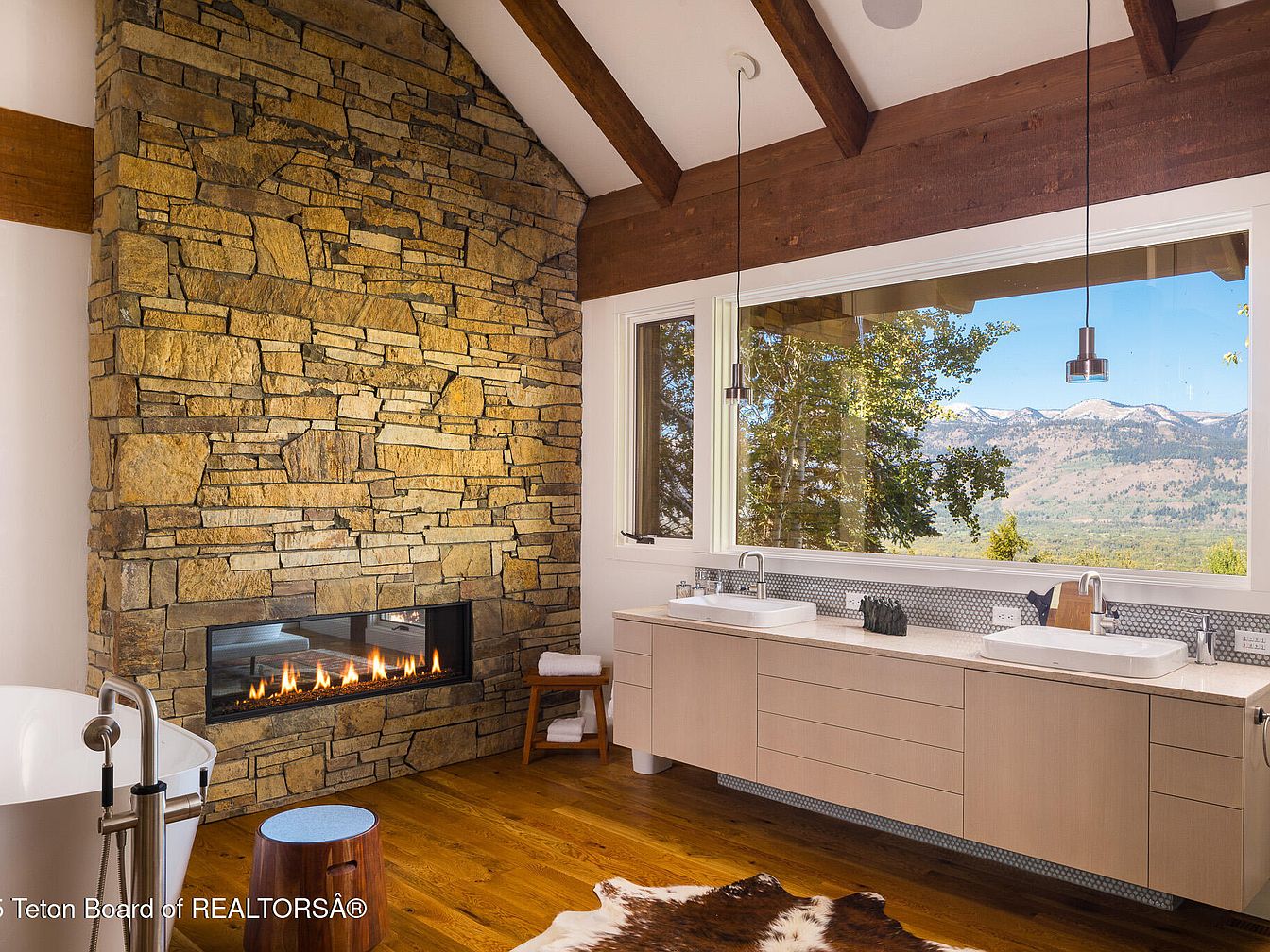 This luxurious master bathroom blends elegance and comfort, featuring a stunning stone fireplace that creates a warm focal point. The dual vanities are crafted with sleek cabinetry, complemented by stylish square basins that enhance the contemporary aesthetic. Large windows frame breathtaking views of the mountains, inviting natural light to enhance the space. Warm wood tones gleam underfoot, contrasting beautifully with the muted neutral palette. A modern freestanding tub offers a serene spot for relaxation, while unique pendant lighting adds a touch of sophistication. This design effortlessly combines functionality and tranquility, ideal for family use or personal retreats.