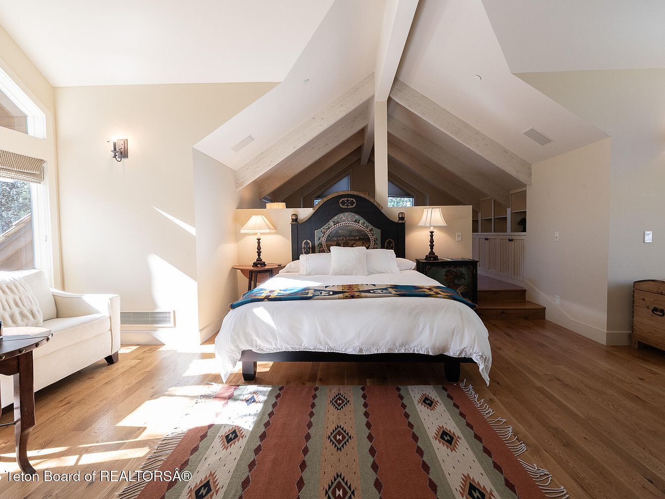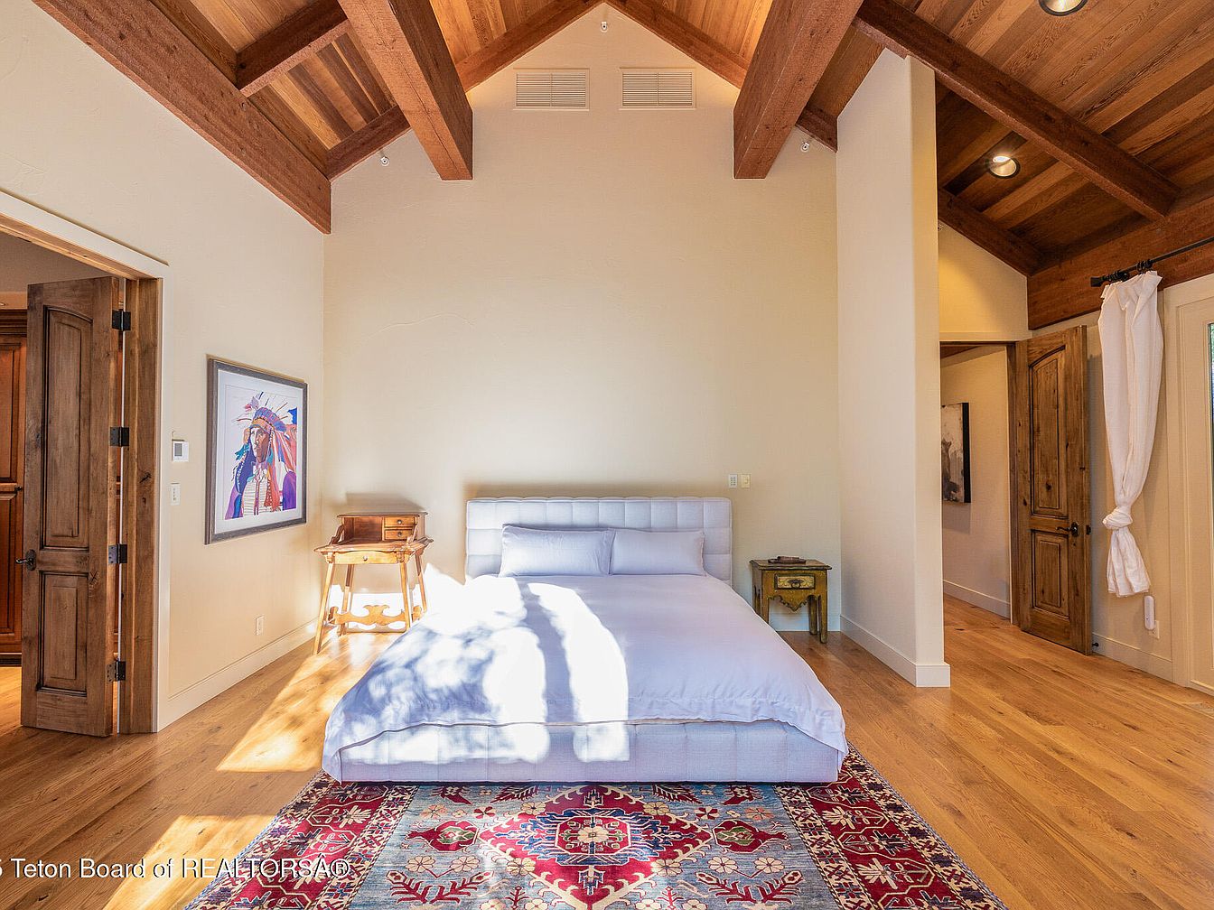 This serene master bedroom showcases a harmonious blend of modern aesthetics and rustic charm. Featuring high, vaulted ceilings with exposed wooden beams, the space exudes warmth and comfort. The striking hardwood floor enhances the inviting atmosphere, while the crisp white bed adds a touch of elegance. A vibrant area rug adds color and texture, creating a perfect focal point. The corner side table, paired with an artistic portrait, offers both functionality and visual appeal. Ample natural light floods the room through large windows, enhancing the calming color palette and fostering a peaceful environment for relaxation.