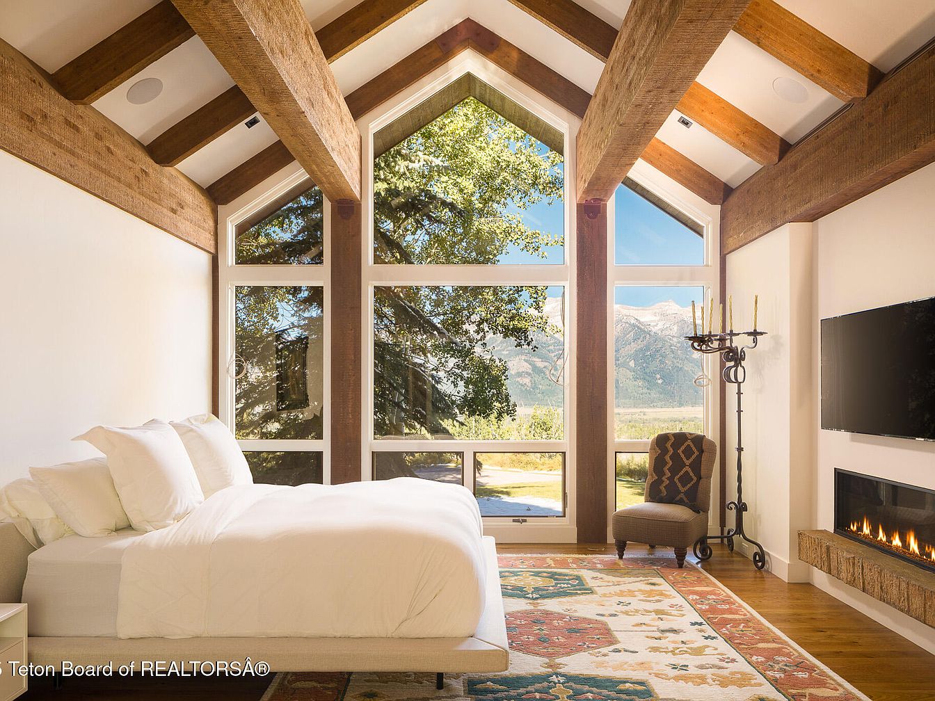 This master bedroom exudes tranquility and elegance, featuring soaring vaulted ceilings adorned with rustic wooden beams that provide a warm contrast to the clean, modern lines. The large windows frame breathtaking mountain views, inviting natural light to fill the space. A plush king-sized bed with crisp white linens takes center stage, complemented by a vibrant area rug that adds a splash of color and texture. The cozy reading nook, highlighted by a stylish upholstered chair, offers a perfect spot for relaxation. A sleek fireplace and minimalist entertainment unit enhance the room’s contemporary feel while maintaining a welcoming atmosphere.