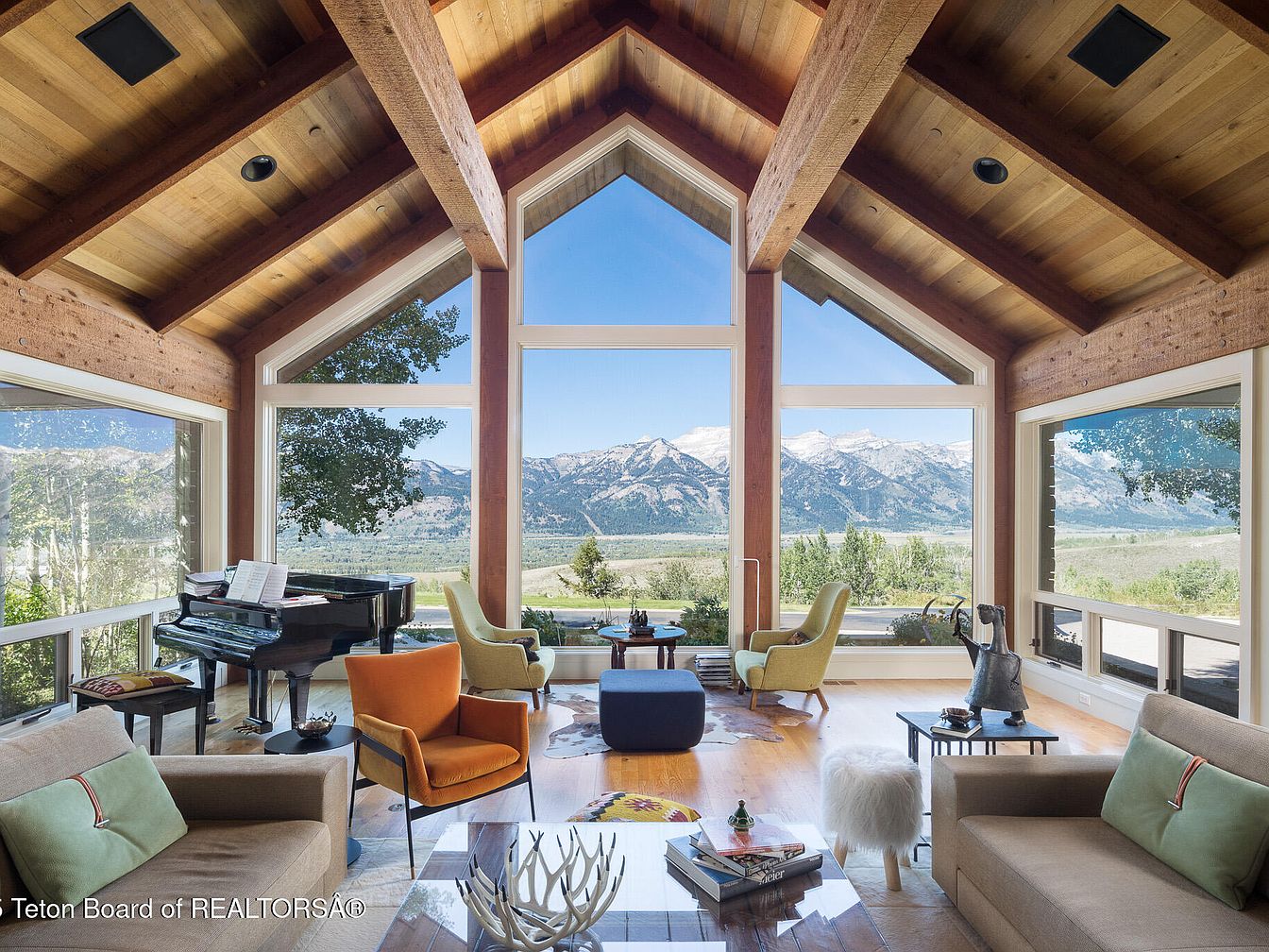 A stunning living area characterized by soaring vaulted ceilings and expansive windows, framing breathtaking mountain views. The thoughtful layout encourages family gatherings, featuring a harmonious mix of contemporary furniture in vibrant hues. A plush grey sofa contrasts beautifully with an orange accent chair and a greenish armchair, creating an inviting atmosphere. The natural wooden beams and warm flooring enhance the rustic charm, while a chic piano hints at a musical touch in the home. Decor elements like a stylish coffee table and artistic accents add personality, resulting in a cozy yet elegant space perfect for relaxation and entertainment.