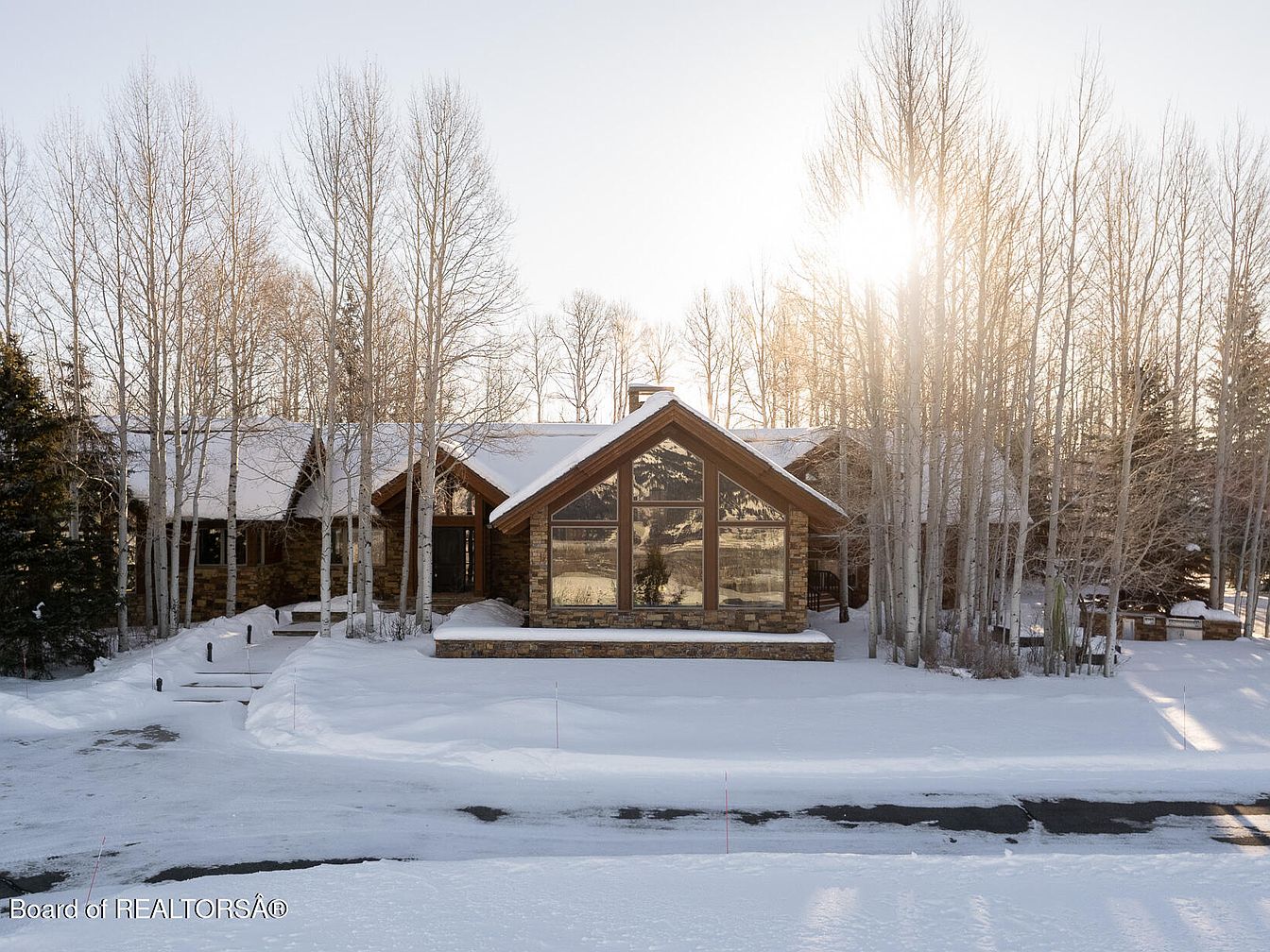This stunning home showcases a harmonious blend of rustic charm and contemporary design, nestled amidst a winter wonderland. Architectural details include a prominent gabled roof and expansive windows framed by natural stone, allowing natural light to flood the interior while offering scenic views of the surrounding landscape. Family-friendly features are evident, with a welcoming entry pathway leading to a spacious front porch, perfect for gathering. The color scheme embraces warm wood tones, complemented by the white snow and serene aspen trees. This inviting retreat balances comfort and elegance, making it an ideal sanctuary for families seeking connection with nature.