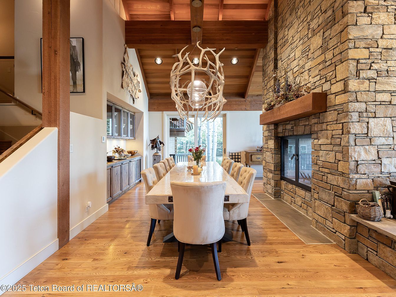 This inviting dining room exudes warmth and comfort, showcasing a spacious wooden table surrounded by plush upholstered chairs. Natural light pours in through large windows, enhancing the earthy palette of warm browns and soft neutrals. A striking stone fireplace creates a cozy focal point, lined with tasteful décor, while a unique antler chandelier draws the eye upward to the high, beamed ceilings. The open layout promotes a family-friendly atmosphere, perfect for gatherings. Accents like the rustic wooden sideboard and carefully curated art pieces add character, creating a harmonious blend of contemporary and rustic style.