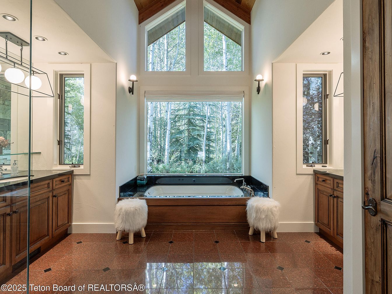 This exquisite bathroom combines elegance with comfort in a spacious layout, boasting high ceilings illuminated by modern fixtures. Natural light streams through expansive windows, framing breathtaking views of the outdoors and creating a serene atmosphere. The rich wooden cabinetry adds warmth, complemented by sleek black countertops. A luxurious soaking tub sits invitingly by the window, perfect for relaxation. Two plush stools enhance the space, offering stylish seating options. The polished floor with subtle accents enhances the overall aesthetic, making this a family-friendly oasis that seamlessly blends modern design with natural beauty, ideal for rejuvenation.