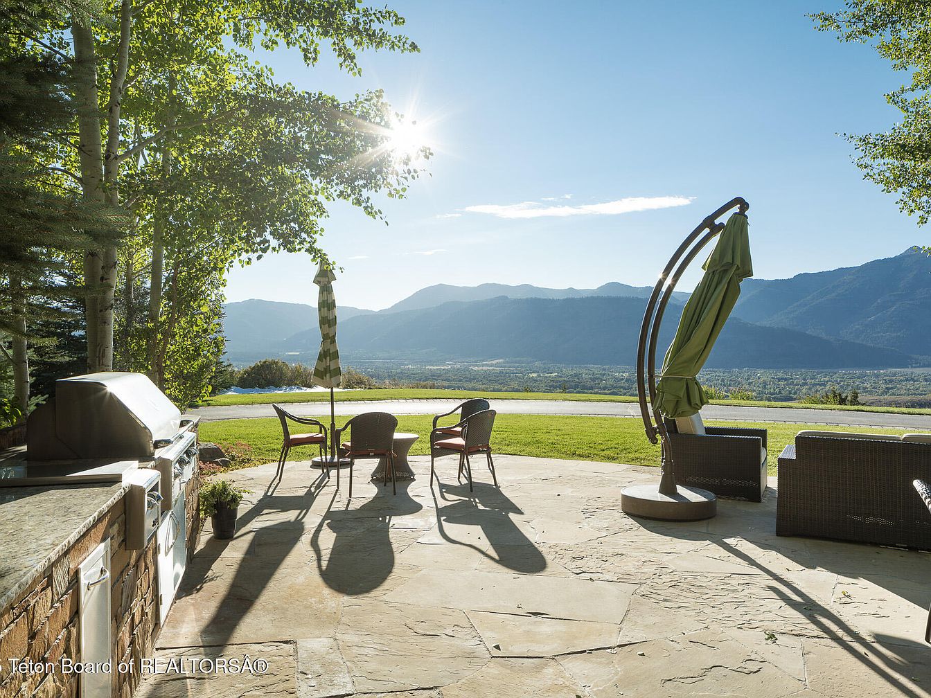 A stunning outdoor patio blends luxury with nature, featuring a built-in grill adorned with a rich granite countertop that invites alfresco dining. Comfortable lounge chairs offer a cozy retreat, paired with a stylish circular table ideal for gatherings. A large, elegant umbrella provides shade while enhancing the space’s charm. Lush trees frame the view, and the expansive backdrop of mountains captures the essence of tranquility. The sandstone flooring complements the earthy tones of the furniture, creating a harmonious aesthetic that is perfect for family-friendly gatherings and relaxation, making this patio an idyllic retreat for all occasions.