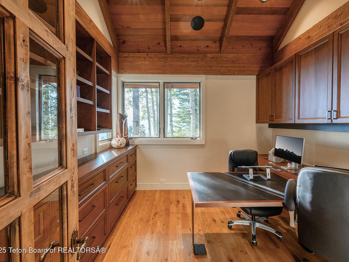 This inviting home office features a spacious layout that promotes productivity and comfort. The warm wooden floors complement the rich cabinetry, while expansive windows offer stunning views of the natural surroundings, flooding the space with light. The ceiling showcases beautiful wooden beams, enhancing the rustic charm. A sleek black desk contrasts elegantly with the warm tones, paired with ergonomic chairs that ensure comfort during long work hours. Ample storage is provided by built-in shelving and drawers, keeping the space organized. This office blends functionality with a serene ambiance, making it an ideal retreat for work or study.