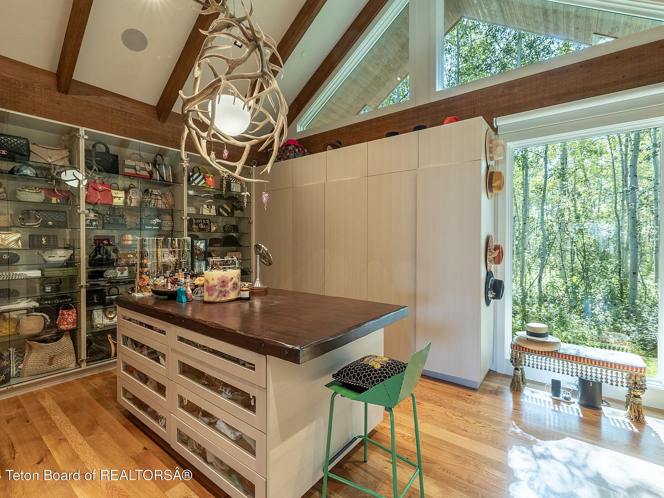 This elegant closet features an expansive design with natural light cascading through large windows, creating an inviting atmosphere. A wooden centerpiece island, crafted with a rich dark finish, offers ample storage and workspace. Surrounding glass cabinetry showcases a carefully curated collection of purses and accessories, blending functionality with high style. The open layout invites easy movement, ensuring a family-friendly environment. Rustic wooden beams accentuate the ceiling, harmonizing with the modern aesthetic. Vibrant green seating elevates the space, while artfully arranged hats on the wall add a playful touch, making this closet a delightful retreat for fashion enthusiasts.