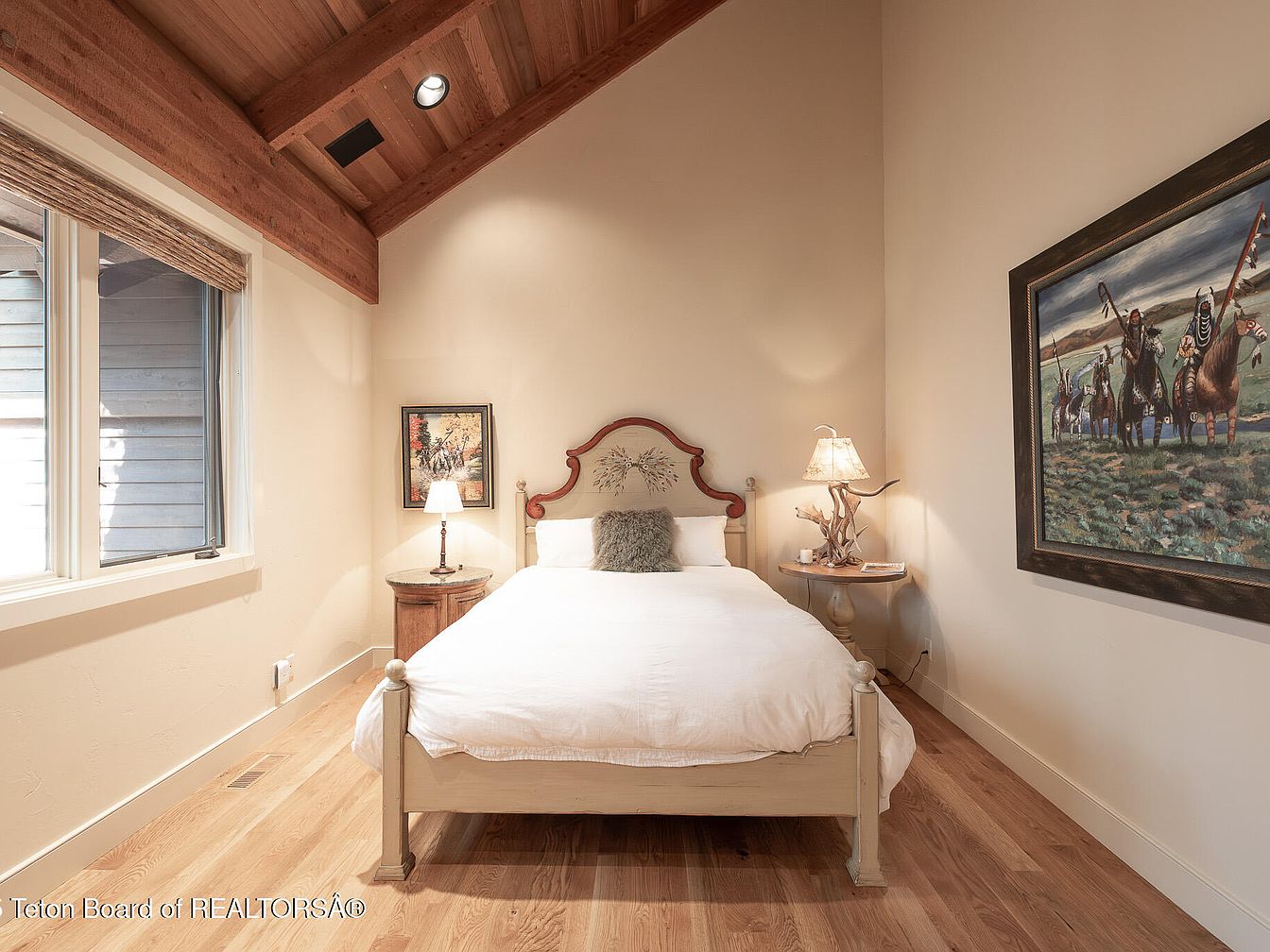This inviting bedroom features a unique combination of rustic charm and modern comfort, highlighted by a striking vaulted ceiling with exposed wooden beams. The soft, neutral color palette creates a calming atmosphere, complemented by warm hardwood flooring that adds to the home’s cozy feel. A comfortable bed with an elegantly designed wooden frame offers a welcoming focal point, while a petite bedside lamp provides gentle lighting for evening relaxation. Artwork depicting a serene scene adorns the wall, adding character and a touch of cultural homage. Large windows invite natural light, enhancing the room’s spacious feel and connection to the outdoors.