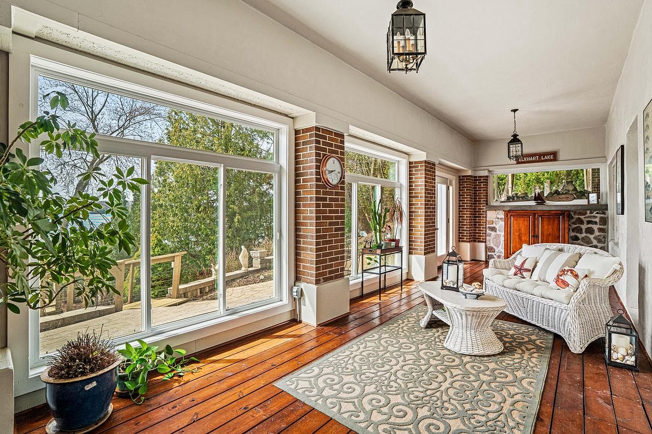 Natural light floods this inviting sunroom, where large windows frame serene views of the surrounding landscape. The warm wooden flooring complements the cozy wicker furniture, adorned with plush cushions for comfort. A subtle color palette of soft whites and earthy tones enhances the tranquil atmosphere. Architectural details like the exposed brick accents add character, while plants strategically placed by the windows bring a touch of nature indoors. Ideal for family gatherings or peaceful mornings, this versatile space encourages relaxation and connection with the outdoors, making it the perfect retreat within the home.