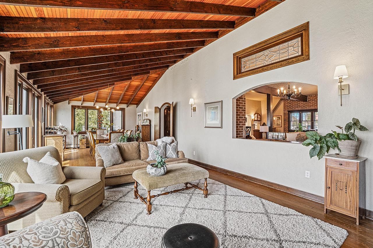This inviting living room features an open layout with sloped wooden ceilings that enhance the spaciousness. Warm, earthy tones dominate the color scheme, complemented by natural light streaming through expansive windows. The cozy beige sofa, adorned with patterned pillows, is positioned to create a welcoming gathering spot. A charming, round coffee table with a muted palette serves as a functional centerpiece. Architectural elements like archways add character, while the plush area rug offers a family-friendly touch. Nearby, a dining area is seamlessly integrated, making it perfect for entertaining or family interactions, embodying comfort and elegance.