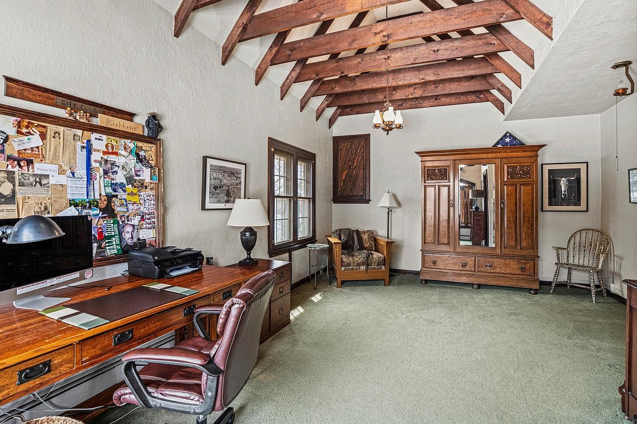 This cozy home office features vaulted ceilings with stunning wooden beams, creating an inviting and spacious atmosphere. A sturdy wooden desk, complete with a comfortable leather chair, invites productivity, while a bulletin board adorned with personal mementos adds a touch of personality. The warm color scheme, characterized by earthy tones and rich woods, complements the natural light streaming through the large windows. A plush, green carpet provides comfort underfoot, perfect for family-friendly use. The room is thoughtfully arranged with an elegant armoire and a cushy armchair, making it a versatile space for both work and relaxation.