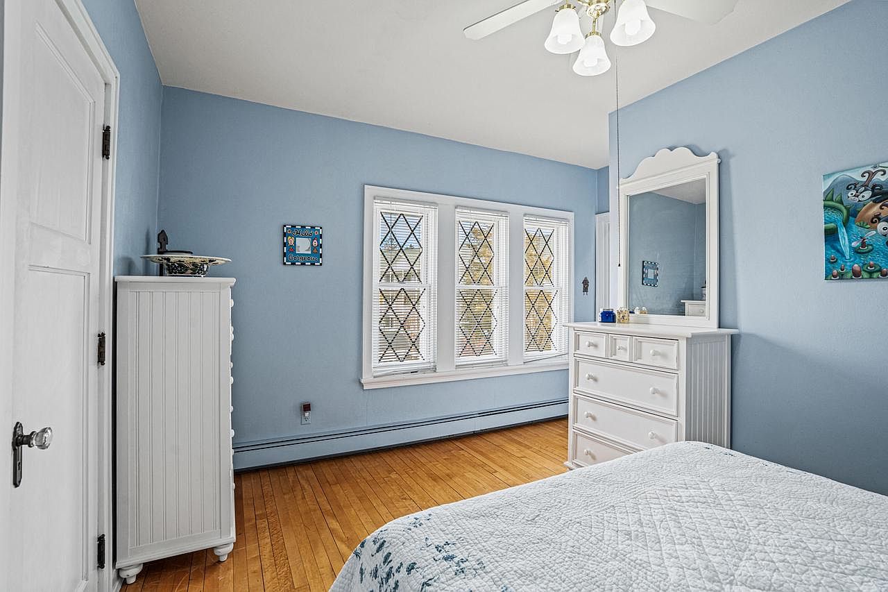 This charming kid’s bedroom combines a tranquil blue palette with functional design. The walls are painted in a soft sky blue, promoting a calming atmosphere, while natural light floods through charming diamond-patterned windows. A white, flowing quilt covers the bed, complemented by matching white furniture, including a dresser and a tall storage unit, adding elegance and practicality. The simple ceiling fan provides comfort during warmer months. Decorative elements, such as a playful piece of art and a whimsical wall hanging, contribute to a lively yet serene environment perfect for creativity and restful sleep.